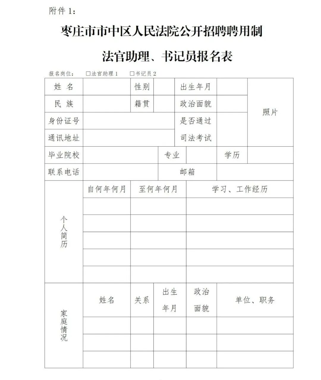 附件:《枣庄市市中区人民法院招聘法官助理、书记员报名表》